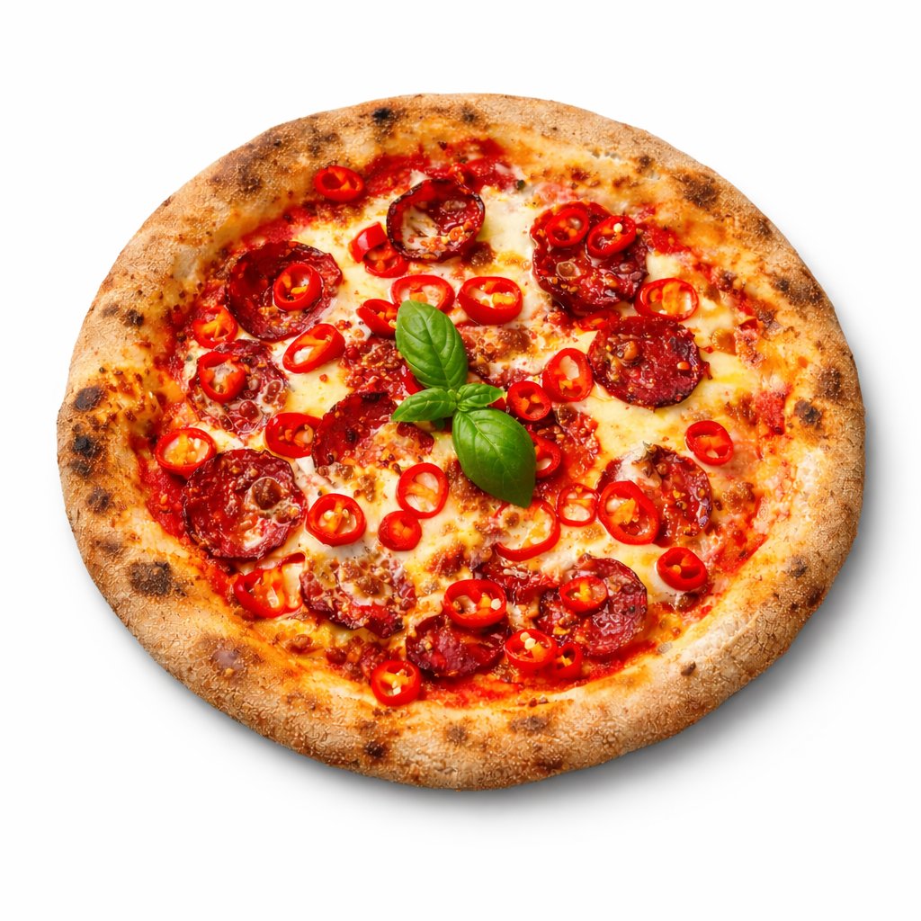 rajčatový základ San Marzano DOP, mozzarella, pikantní salám, chilli, olivový olej