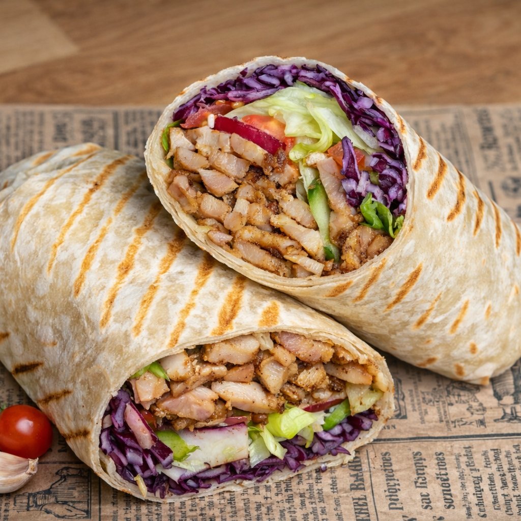 Jemně opečená velká pšeničná tortilla plněná šťavnatým kuřecím gyros masem, čerstvým ledovým salátem, červeným zelím, rajčetem, okurkou, cibulkou a sýrem Grana Padano.