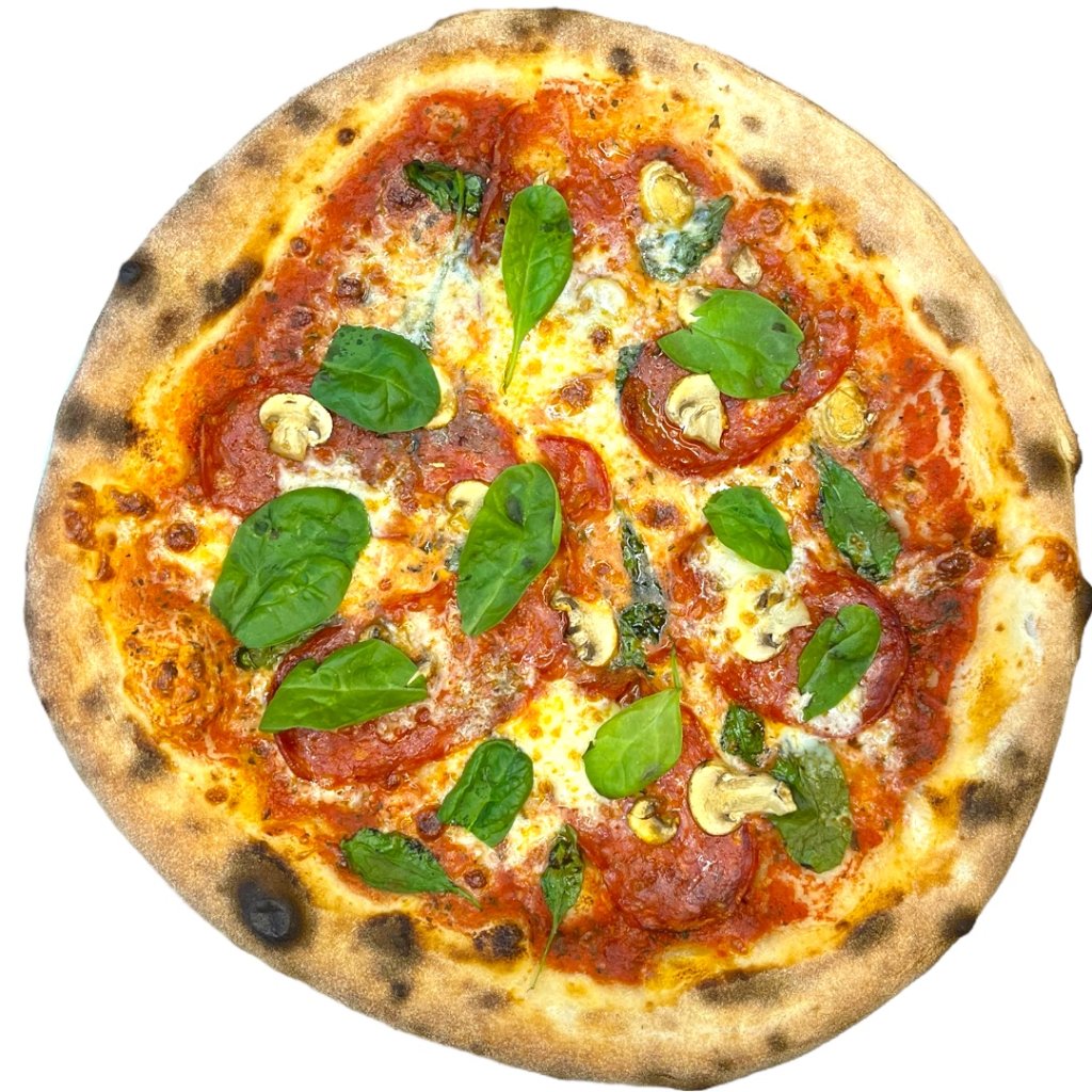 rajčatový základ San Marzano DOP, mozzarella, uzený sýr, salám Spinata Picante, žampiony, baby špenát