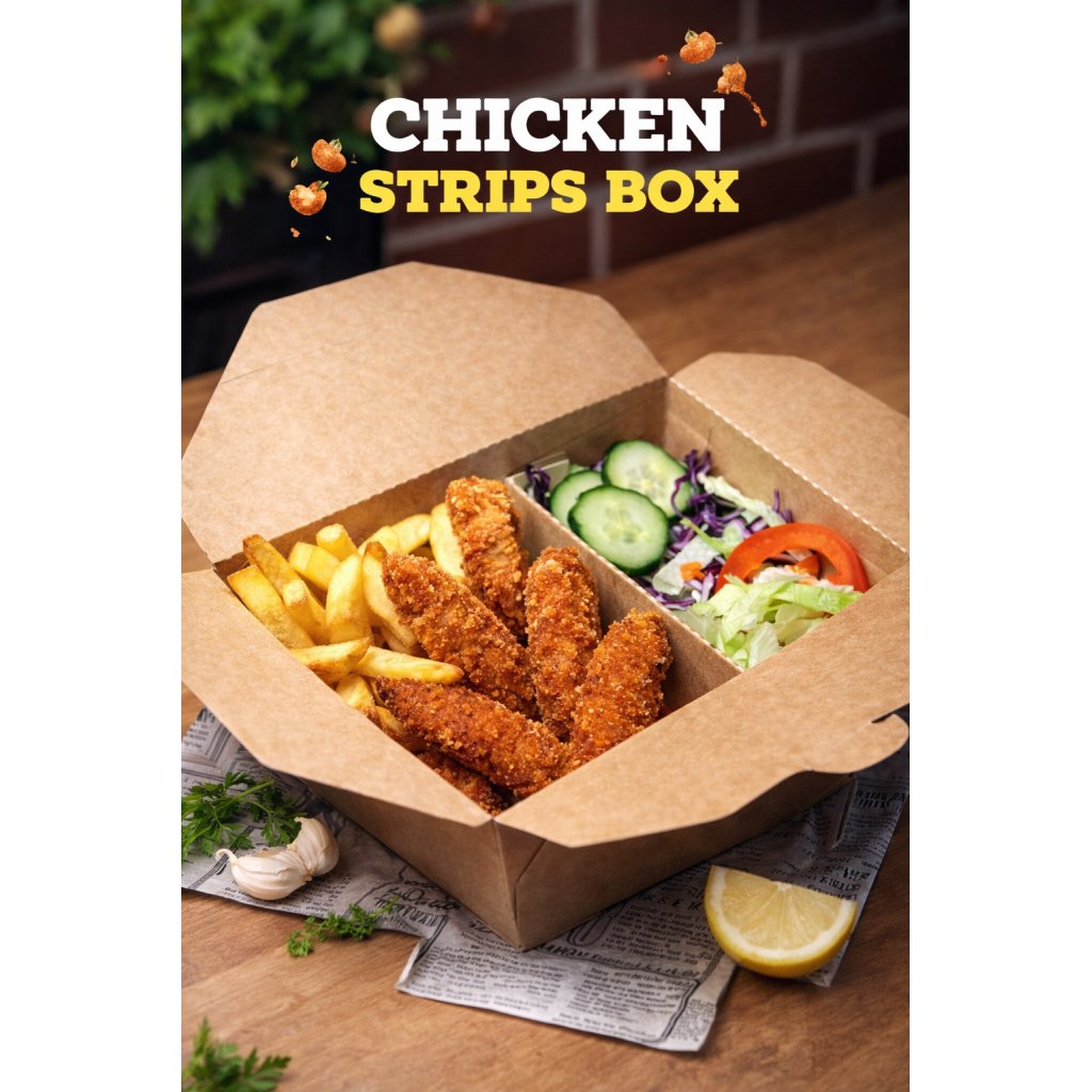 kuřecí stripsy, hranolky, červené zelí, ledový salát, rajče, okurka, cibule, omáčka dle výběru a balné v ceně