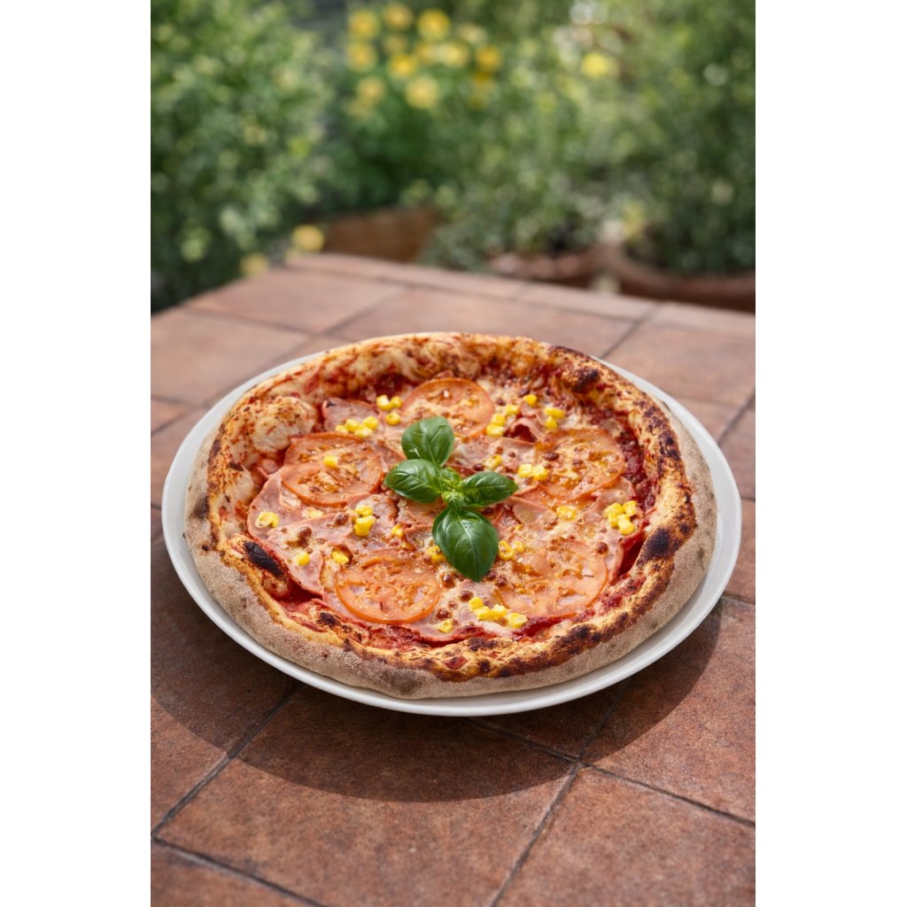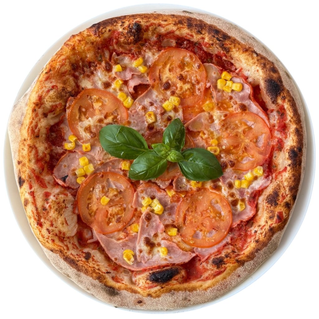rajčatový základ San Marzano DOP, mozzarella, šunka nejvyšší jakosti, rajče nebo kukuřice